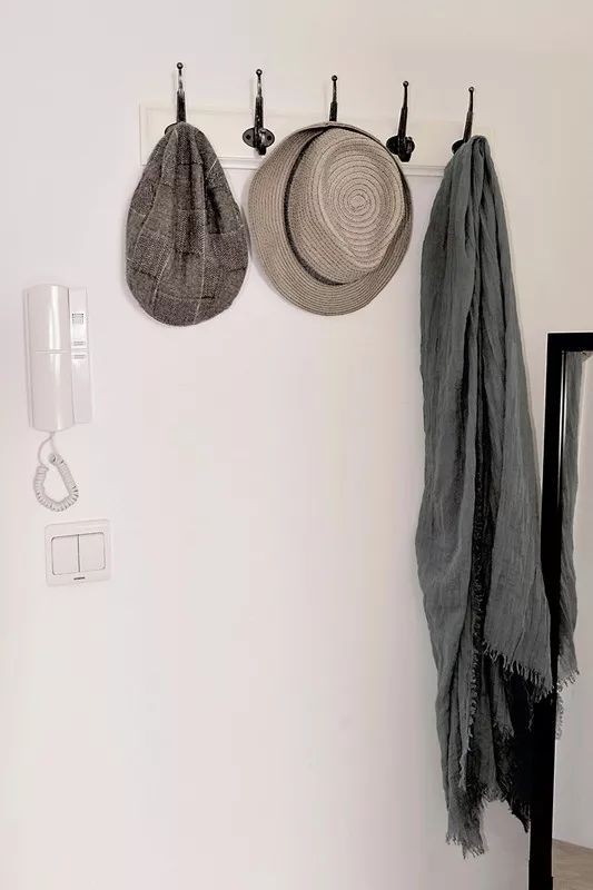 户型结构问题,这些是入户进来正对着一面墙应该算是玄关吧,比较有装饰性的黑白挂钩,不仅仅方便也是丰富了玄关的格局。